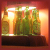 Description: a cluster of empty yuengling lager bottles under a lamp.